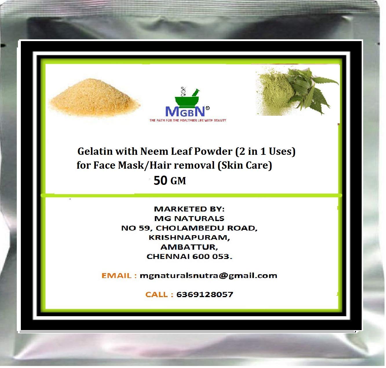 Both Gelatin and Neem Leaf Powders are 100 % Natural Fine Powders*Ideal For Face Masks, Skin Care, Exfoliation and Brightening*Clean the Pores of Face, Skin and Body removes the whiteheads & blackheads*Pull the unwanted Excess Oils from your Skin*It helps pull the Dirt out of your Pores, making them less Visible. This makes it great for even Sensitive Skins. *Gelatin is a universal remedy for skin care.It perfectly cleanses, tones, nourishes, whitens and rejuvenates the skin.