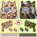 Tactical Vest Kit 2 PACK Value suit- Birthday party supplies for 2 kids includes gear for 2 teams. Each kid gets 1 camo print tactical vest, 1 pack foam blasters gun toy, 40 units foam refill bullet darts. The equipment is in two colors camo cosplay for kids age 6 to 16 years boys adult