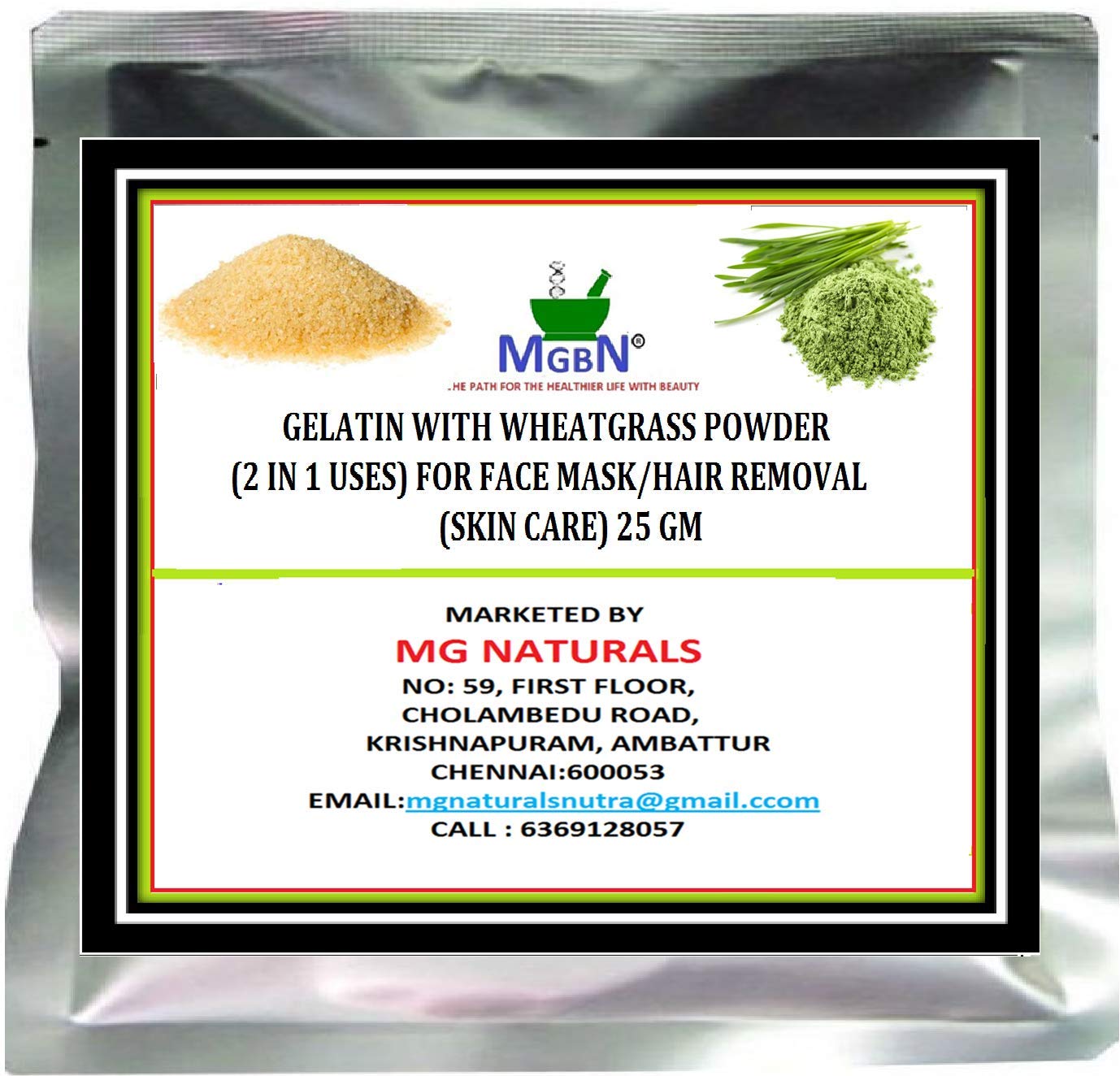 *Both GELATIN AND WHEATGRASS POWDER are 100 % Natural Fine Powders*Ideal For Face Masks, Skin Care, Exfoliation and Brightening*Clean the Pores of Face, Skin and Body removes the whiteheads & blackheads*Pull the unwanted Excess Oils from your Skin*It helps pull the Dirt out of your Pores, making them less Visible. This makes it great for even Sensitive Skins.