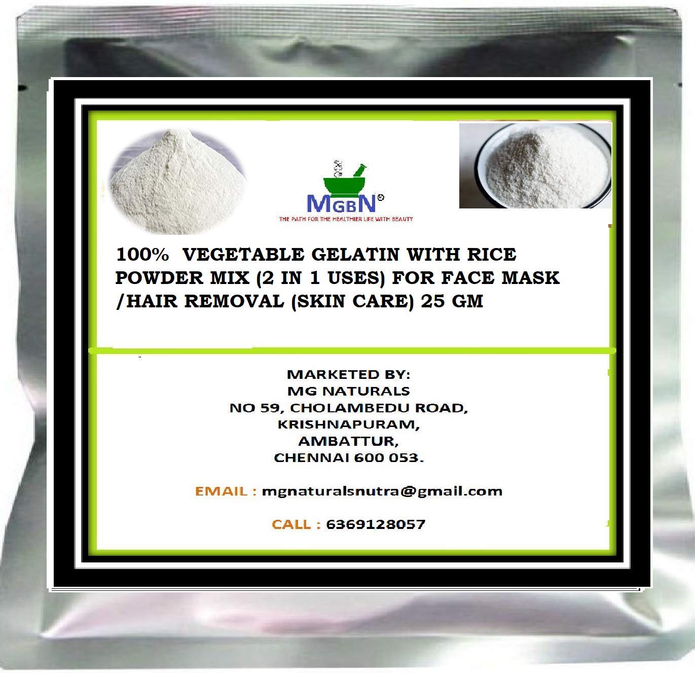 *Both Vegetable Gelatin and Rice Powder are 100 % Natural Fine Powders*Ideal For Face Masks, Skin Care, Exfoliation and Brightening*Clean the Pores of Face, Skin and Body removes the whiteheads & blackheads*Pull the unwanted Excess Oils from your Skin*It helps pull the Dirt out of your Pores, making them less Visible. This makes it great for even Sensitive Skins.