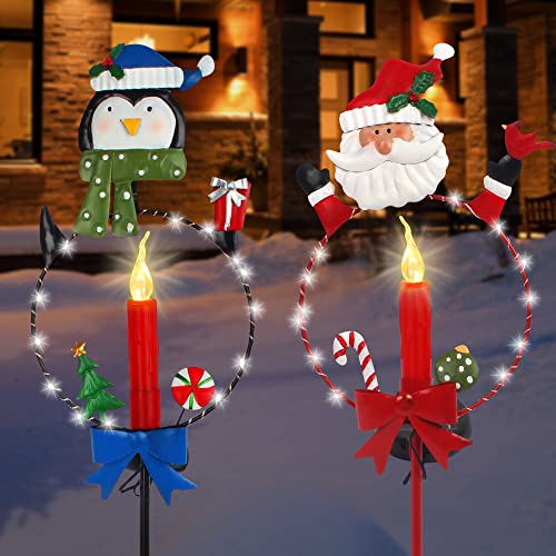 ✨【Unique Outdoor Christmas Design】Lovely and full of personality Santa Claus/penguin design with candle shape LED light and Surround a circle of LED light strips.The solar garden stake light is made of durable metal and plastic, waterproof with long-lasting anti-rust paint,it will capture people's attention and amaze them.