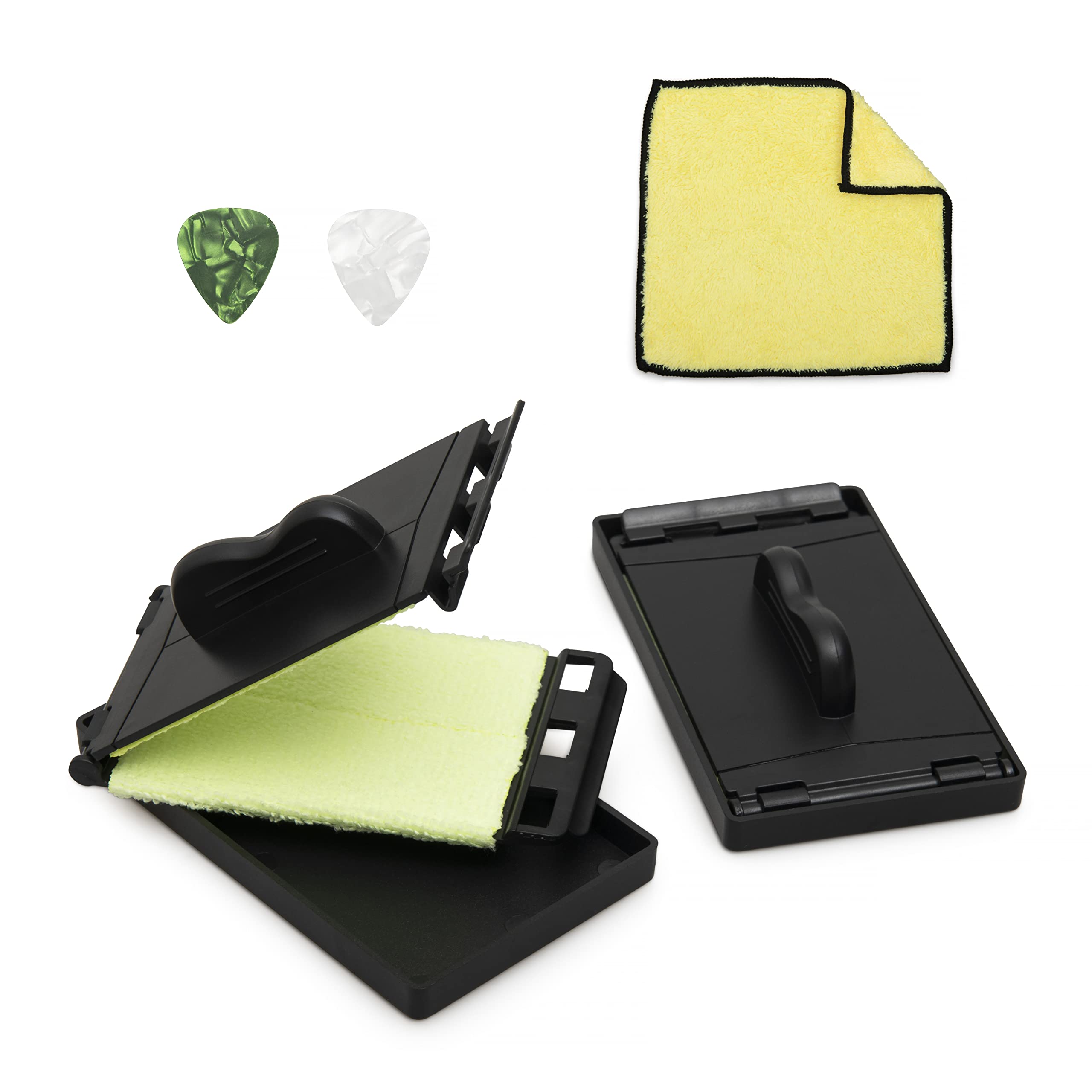 Constructed from premium-quality, strong, sturdy and durable plastic in an attractive black color with an ergonomic handle to easily slide the tool along the strings. Dual-sided microfiber cloth is super soft and long-lasting with great absorption which is perfect for ridding your guitar strings from lint, dirt, dust, pet hairs and even oil. Clean strings last longer and improve the longevity of your instrument's tone.