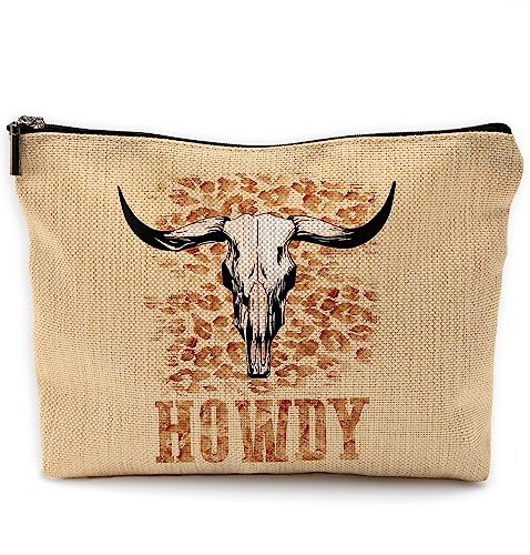 NEGIGA Retro Western Country Cowboy Leopard Bull Skull Howdy Cosmetic Bags with Zipper Pouch Travel Toiletry Case,Cowgirl Gifts,Cowgirl Gifts for Girls